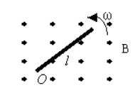 在如图所示的匀强磁场中 (磁感应强度为 B), 有一个长 为 1 的导体细棒绕过 0 点的平行于磁场的轴以角速度 $\omega$ 在垂直于 磁场的平面内转动, 则导体细棒上的动生电动势大小为