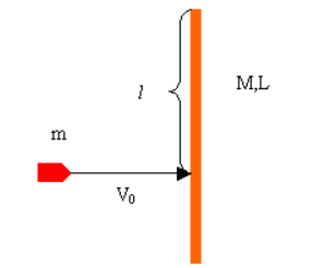 一长为 $\mathrm{L}$ 质量为 $\mathrm{M}$ 的匀质细棒, 可绕上端点处水 平轴在坚直平面内自由转动, 初始时刻静止在平衡位置。(如 图, 现有一颗质量为 $\mathrm{m}$ 的子弹以初速度 $\mathrm{v}_0$ 水平射入细棒的转轴 下方 1 处(嵌入其中)。试求细棒受到子弹打击后上摆的最大角 度。 $\left(J=m L^2 / 3\right)$