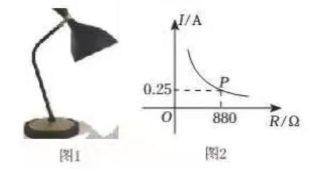 如图1是一个亮度可调节的台灯,其灯光亮度的改变,可以通过调节总电阻控制电流的变化来实现,如图2是该台灯电流$I$与电阻$R$成反比例函数的图像,该图像经过点$P(880,0.25)$ 根据图像可知,下来说法正确的是