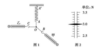 某同学在做“验证力的平行四边形定则”实验时, 将橡皮筋改为劲度系数为 400 $\mathrm{N} / \mathrm{m}$ 的轻质弹簧 $A A^{\prime}$, 将弹簧的一端 $A^{\prime}$ 固定在坚直墙面上. 不可伸长的细线 $O A 、 O$ $B 、 O C$, 分别固定在弹簧的 $A$ 端和弹簧秤甲、乙的挂钩上, 其中 $O$ 为 $O A 、 O B 、 O C$ 三段细线的结点, 如图1所示. 在实验过程中, 保持弹簧 $A A^{\prime}$ 伸长 $1.00 \mathrm{~cm}$ 不变