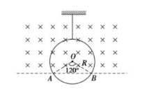 如图所示, 在天花板下用细线悬挂一半径为 $R$ 的金属圆环, 圆环处于静止状态, 圆环一部分处在垂直于环面的磁感应强度大小为 $B$ 的水平匀强磁场中, 环与磁场 边界交点 $A 、 B$ 与圆心 $O$ 连线的夹角为 $120^{\circ}$, 此时悬线的拉力为 $F$. 若圆环通电, 使 悬线的拉力刚好为零, 则环中电流大小和方向是