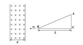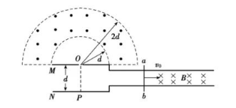 如图所示, 间距为 $d$ 的平行金属板 $M N$ 与一对光滑的平行导轨相连, 平行导轨间距为 $L$. 一根导体棒 $a b$ 与导轨垂直且以速度 $v_0$ 沿导轨向右匀速运动, 棒的右側存在一个垂直纸面向里, 大小为 $B$ 的匀强磁场. 当棒进入磁场时, 粒子源 $P$ 释放一个初速度为零的带负电的粒子, 已知带电粒子的质量为 $m$ (重力不计), 电量为 $q$.粒子经电场加速后从 $M$ 板上的小孔 $O$ 穿出. 在板的上方, 有一个环形区域内存在垂直纸面向外的匀强磁场. 已知外圆半怪为 $2 d$, 内圆半径为 $d$, 两圆的圆心与小孔重合 ,