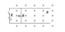 水平放置足够长的光滑平行导轨, 电阻不计, 间距为 $\boldsymbol{L}$, 左端连接的电源电动. 势为 $E$, 内阻为 $r$, 质量为 $m$ 的金属杆垂直静放在导轨上, 金属杆处于导轨间的剖 分电阻为 $R$. 整个装置处在磁感应强度大小为 $B$ 、方向竖直向下的匀强磁场中, 闭 合开关, 金属杆沿导轨做变加速运动直至达到最大速度, 则下列说法正确的是