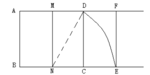 第三步: 以 $\mathrm{N}$ 为圆心, $\mathrm{ND}$ 长为半径画弧, 交 $\mathrm{BC}$ 的延长线于 $\mathrm{E}$ 。