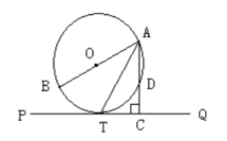 如图, $\mathrm{AB}$ 为 $\odot O$ 的直径, $\mathrm{PQ}$ 切 $\odot O$ 于 $\mathrm{T}, A C \perp P Q$ 于 $\mathrm{C}$, 交 $\odot O$ 于 $\mathrm{D}$ 。