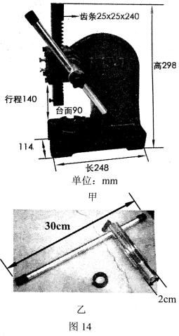 如图14甲所示为手动压力机,厂家己标出部分尺寸,其他相关尺寸可根据图甲估测获得。压力机手柄拆卸下来的结构如图14乙所示,手柄总长度为30 cm,手柄连接的齿轮直径为2 cm。向下压手柄右端时通过齿轮带动齿条向下运动,可对放在台面上的物体施加巨大压力。若此压力机的规格是可产生5000N的压力,总质量为9 kg。请通过估算说明:根据该压力机的设计规格,若手柄转到任何方位时都能正常工作,在将该压力机放在水平桌面上使用时,是否需要用螺栓将其固定在工作台上?(g取10N/kg)