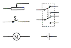 明光中学物理实践小组在装配直流电动机模型后参加班级的实践成果展示交流会,在会上演示通过改变直流电动机的转动方向及转速使重物上升或下降的过程。电路元件包括一个单刀单掷开关、一个双刀双掷开关、一个滑动变阻器、一个小型直流电动机和一个直流电源,如图所示。请完成电路图的连接以实现上述功能。(操作过程中只能扳动开关,不得再改变电路中的接线)