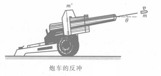 如图 所示, 设炮车以仰角 $\theta$ 发射一炮弹, 炮车和炮弹的质量分别为 $m^{\prime}$ 和 $m$,炮弹 的出口速度的大小为 $v$, 求炮车的反冲速度 $v^{\prime}$ 及后退距离. 炮车与地面之间的摩擦力略 去不计.