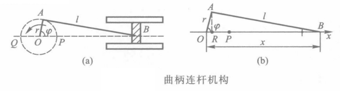 如图所示为一曲柄连杆机构, 曲柄 $O A$ 长为 $r$, 连杆 $A B$ 长为 $l . A B$ 的一端用销子 在 $A$ 处与曲柄 $O A$ 相连, 另一端以销子在 $B$ 处与活塞相连. 当曲柄以匀角速 $\omega$ 绕轴 $O$ 旋转 时, 通过连杆将带动 $B$ 处活塞在汽缸内往复运动, 试求活塞的运动学方程、速度 $v$ 和加速 度 $a$ 与 $t$ 的关系式.