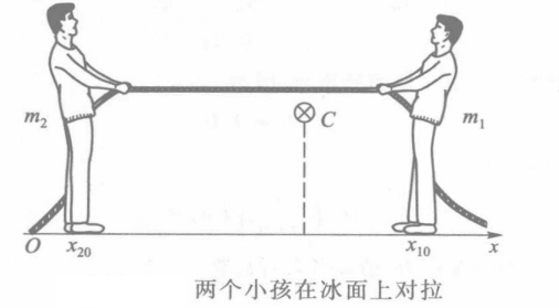 质量为 $m_1$ 和 $m_2$ 的两个小孩, 在光滑水平冰面上用绳彼此拉对方. 开始时静止, 相距 为 $l$. 问他们将在何处相遇?