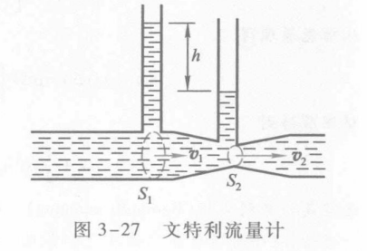 测流量的文特利流量计如图 3-27 所示. 若已知截面 $S_1$ 和 $S_2$ 的大小以及流体密度 $\rho$, 由两根竖直向上的玻璃管内流体的高度差 $h$, 即可求出流量 $Q$.