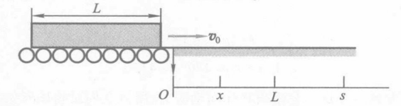 传送机通过滑道将长为 $L$ 、质量为 $m$ 的柔软匀质物体以初速 $v_0$ 向右送上水平台面, 物 体前端在台面上滑动 $s$ 距离后停下来 (见图 2-23). 已知滑道上的摩擦可不计, 物与台面 间的摩擦因数为 $\mu$, 而且 $s>L$, 试计算物体的初速度 $v_0$.