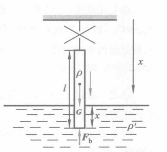 有一密度为 $\rho$ 的细棒, 长度为 $l$, 其上端用细线悬着, 下端紧贴着密度为 $\rho^{\prime}$ 的液体表 面. 现将悬线剪断,求细棒在恰好全部没人液体中时的沉降速度. 设液体没有黏性.