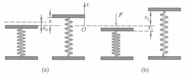 用一弹簧将质量分别为 $m_1$ 和 $m_2$ 的上下两水平木板连接如图 2-36 所示, 下板放在地 面上. (1) 如以上板在弹簧上的平衡静止位置为重力势能和弹性势能的零点, 试写出上 板、弹簧以及地球这个系统的总势能 . (2) 对上板加多大的向下压力 $F$, 才能因突然撤去 它,使上板向上跳而把下板拉起来?
