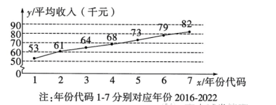 某乡政府为提高当地农民收人, 指导农民种植药材, 并在种植药材的土地附近种 草放牧, 发展畜牧业. 牛粪、羊粪等有机肥可以促进药材的生长, 发展生态循环农 业. 下图所示为某农户近 7 年种植药材的平均收人 $y$ (单位: 千元) 与年份代码 $x$ 的 折线图. 并计算得到 $\sum_{i=1}^7 y_i=480, \sum_{i=1}^7 x_i y_i=2052, $