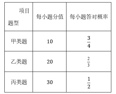 为普及航空航天科技相关知识、发展青少年航空航天科学素养,贵州省某中学组织开展“筑梦空天”航空航天知识竞赛.竞赛试题有甲、乙、丙三类(每类题有若干道),各类试题的每题分值及小明答对概率如下表所示,各小题回答正确得到相应分值,否则得0分,竞赛分三轮答题依次进行,各轮得分之和即为选手总分.