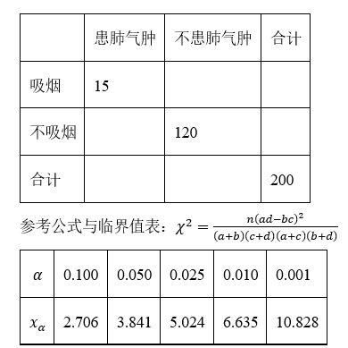 某研究机构为了探究吸烟与肺气肿是否有关,调查了200人.统计过程中发现随机从这200人中抽取一人,此人为肺气肿患者的概率为0.1.在制定2×2列联表时,由于某些因素缺失了部分数据,而获得如图所示的2×2列联表,下列结论正确的是