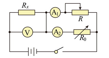 (2) 电路图中电流表 $\mathrm{A}_2$ 与电阻箱 $R_0$ 串联后改装成量程为“ $0 \sim 3.0 \mathrm{~V}$ ”的电压表, 则电路图中 的电压表 $\mathrm{V}$ 选 , 电流表 $A_1 、 A_2$ 分别选 (填器材前面的字母)。