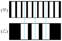 用某种单色光进行双缝干涉实验,在屏上观察到的干涉条纹如图甲所示,改变双缝间的距离后,干涉条纹如图乙所示,图中虚线是亮纹中心的位置。则双缝间的距离变为原来的