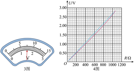(3) 将滑动变阻器滑片移动到合适位置后保持不变, 依次测量电路中 $O$ 与 1 , $2, \ldots, 21$ 之间的电压. 某次测量时, 电压表指针位置如题 3 图所示, 其示数为 V. 根据测量数据作出电压 $U$ 与被测电阻值 $R$ 的关系图线, 如题 4 图中实线 所示.