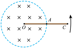 如图所示, 圆形区域内有垂直纸面向里的匀强磁场, $O C$ 导体棒的 $O$ 端位于圆心, 棒 的中点 $A$ 位于磁场区域的边缘。现使导体棒绕 $O$ 点在纸面内逆时针转动。 $O 、 A 、 C$ 点 电势分别为 $\varphi, \varphi 、 \varphi$, 则