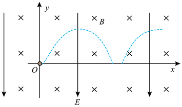 攉尔推进器某局部区域可抽象成如图所示的模型。 $O x y$ 平面内存在坚直向下的匀强电 场和垂直坐标平面向里的匀强磁场, 磁感应强度为 $B$ 。质量为 $m$ 、电荷量为 $e$ 的电子 从 $O$ 点沿 $x$ 轴正方向水平入射。入射速度为 $v_0$ 时, 电子沿 $x$ 轴做直线运动; 入射速度 小于 $v_0$ 时, 电子的运动轨迹如图中的虚线所示, 且在最高点与在最低点所受的合力大 小相等。不计重力及电子间相互作用。