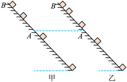 滑块以一定的初速度沿粗糙斜面从底端上滑,到达最高点B后返回到底端。利用频闪仪分别对上滑和下滑过程进行拍摄,频闪照片示意图如图所示。与图乙中相比,图甲中滑块