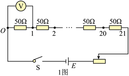 小明通过实验探究电压表内阻对测量结果的影响. 所用器材有: 干电池 (电动势 约 $1.5 \mathrm{~V}$, 内阻不计) 2 节; 两量程电压表(量程 $0 \sim 3 \mathrm{~V}$, 内阻约 $3 \mathrm{k} \Omega$; 量程 $0 \sim 15 \mathrm{~V}$, 内 阻约 $15 \mathrm{k} \Omega$ ) 1 个; 滑动变阻器(最大阻值 $50 \Omega$ ) 1 个; 定值电阻(阻值 $50 \Omega$ ) 21 个; 开关 1 个及导线若干. 实验电路如题 1 图所示.