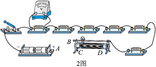 (2) 题 2 图为该实验的实物电路 (右侧末拍全). 先将滑动变阻器的滑片置于如图所 示的位置, 然后用导线将电池盒上接线柱 $A$ 与滑动变阻器的接线柱 (选填 “ $B$ "“ $C$ " " $D$ ") 连接, 再闭合开关, 开始实验.