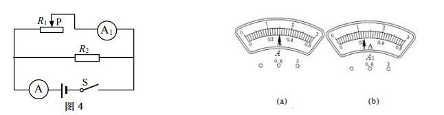 (2) 若将一电流表 $A_1$ 串联在 $R_1$ 支路, 调节滑动变阻器使得两电流表示数如图所示, 求定值电 阻 $R_2$ 阻值。