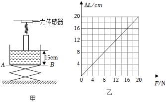 小刘应用图甲所示器材进行如下探究:升降台AB上放置轻质薄壁柱形容器,容器底面积为200cm2,内装15cm深的水;将弹簧上端固定在力传感器上,下端悬挂重20N、高20cm、横截面积为50cm2的长方体石块,石块下表面刚好与水面接触;已知弹簧伸长量ΔL与受到的拉力F的关系如图乙所示。将升降台AB缓慢升高(全过程水不会溢出),当传感器显示拉力为12N时(不计弹簧自重),与升降台升高前相比,容器底部受到的压强变化了 ________ Pa。升降台AB升高的高度为 ________ cm。(ρ水=1×103kg/m3,g=10N/kg)