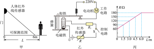 学校组织学生到射洪市“三五三六”厂参加国防教育活动。同学们被展厅自动大门所吸引,他们发现当人靠近大门时,大门自动打开,如图甲所示。回校后,科技小组利用电磁继电器、人体红外传感器,电动机等元件制作了模拟电路,部分电路如图乙所示。其中电动机铭牌上标有“220V 40W”的字样,控制电路的电源电压U为24V,R1为定值电阻,人体红外传感器的阻值R随人体到大门距离L的变化关系如图丙所示;当电磁铁线圈中的电流为100mA时,衔铁刚好被吸下,触发电动机工作,大门打开。(不计电磁铁线圈的电阻)