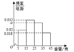 一个盒子中装有大量形状、大小一样但质量不尽相同的小球, 从中随机抽取 50 个作为样本, 称出它们的 质量 (单位: 克), 质量分组区间为 $[5,15),[15,25),[25,35),[35,45]$, 由此得到样本的质量频率分布直方 图如图所示.