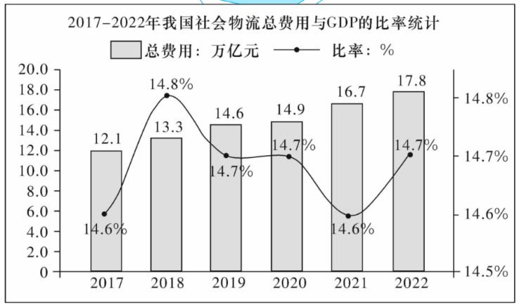 $\text{C.}$ $2017-2022$ 这 6 年我国社会物流总费用与 $G D P$ 的比率的极差为 $0.3 \%$