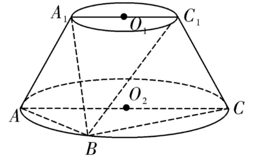 如图, 圆台 $O_1 O_2$ 的轴截面为等腰梯形 $A_1 A C C_1, A C=2 A A_1=2 A_1 C_1=4, B$ 为下底面圆周上异于 $A, C$ 的 点.