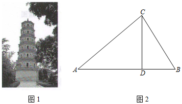 如图 1 是平凉市地标建筑 “大明宝塔”, 始建于明嘉靖十四年 (1535 年), 是明代平凉韩王府 延恩寺的主体建筑. 宝塔建造工艺精湛, 与崆峒山的凌空塔遥相呼应, 被誉为平凉古塔 “双 璧”. 某数学兴趣小组开展了测量 “大明宝塔的高度” 的实践活动, 具体过程如下: 方案设计: 如图 2, 宝塔 $C D$ 垂直于地面, 在地面上选取 $A, B$ 两处分别测得 $\angle C A D$ 和 $\angle C B D$ 的度数 ( $A, D, B$ 在同一条直线上).