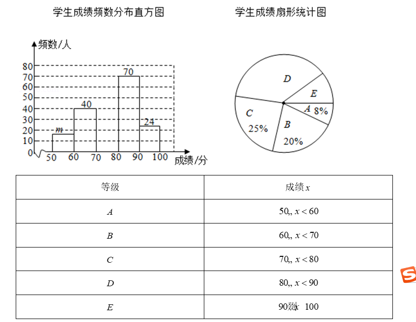 为庆祝中国共产党建党 100 周年, 某校开展了以 “学习百年党史, 汇聚团结伟力”为主题的 知识竞赛, 竞赛结束后随机抽取了部分学生成绩进行统计, 按成绩分成 $A, B, C, D, E$ 五个等级, 并绘制了如下不完整的统计图. 请结合统计图, 解答下列问题: