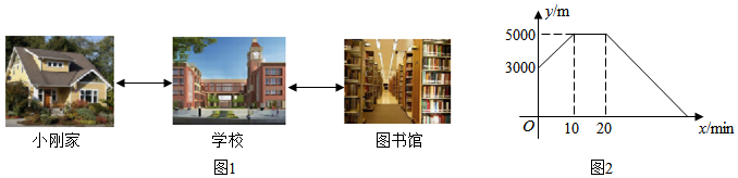 如图 1, 小刚家、学校、图书馆在同一条直线上, 小刚骑自行车匀速丛学校到图书馆, 到达 图书馆还完书后, 再以相同的速度原路返回家中(上、下车时间忽略不计). 小刚离家的距 离 $y(m)$ 与他所用的时间 $x(\min )$ 的函数关系如图 2 所示.