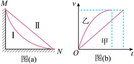 如图 (a), 从高处 $M$ 点到地面 $N$ 点有I、II两条光滑轨道。两相同小物块甲、乙同时 从 $M$ 点由静止释放, 沿不同轨道滑到 $N$ 点, 其速率 $v$ 与时间 $t$ 的关系如图 (b) 所示。 由图可知, 两物块在离开 $M$ 点后、到达 $N$ 点前的下滑过程中