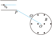 如图, 水平放置的两平行金属板间存在匀强电场, 板长是板间距离的 $\sqrt{3}$ 倍。金属板外 有一圆心为 $O$ 的圆形区域, 其内部存在磁感应强度大小为 $B$ 、方向垂直于纸面向外的匀 强磁场。质量为 $m$ 、电荷量为 $q(q>0)$ 的粒子沿中线以速度 $v_0$ 水平向右射入两板间, 恰好从下板边缘 $P$ 点飞出电场, 并沿 $P O$ 方向从图中 $O^{\prime}$ 点射入磁场。己知圆形磁场区域 半径为 $\frac{2 m v_0}{3 q B}$, 不计粒子重力。