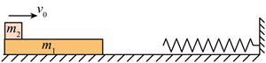 如图, 质量 $m_l=1 \mathrm{~kg}$ 的木板静止在光滑水平地面上, 右侧的坚直墙面固定一劲度系数 $k=$ $20 \mathrm{~N} / \mathrm{m}$ 的轻弹簧, 弹簧处于自然状态。质量 $m_2=4 \mathrm{~kg}$ 的小物块以水平向右的速度 $v_0=\frac{5}{4} \mathrm{~m} / \mathrm{s}$ 滑上木板左端, 两者共速时木板恰好与弹簧接触。木板足够长, 物块与木板 间的动摩擦因数 $\mu=0.1$, 最大静摩擦力等于滑动摩擦力。弹簧始终处在弹性限度内, 弹 簧的弹性势能 $E_p$ 与形变量 $x$ 的关系为 $E_{\mathrm{p}}=\frac{1}{2} k x^2$ 。取重力加速度 $g=10 \mathrm{~m} / \mathrm{s}^2$, 结果可用 根式表示。