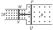 如图, 两根光滑平行金属导轨固定在绝缘水平面上, 左、右两侧导轨间距分别为 $d$ 和 $2 d$, 处于坚直向上的磁场中, 磁感应强度大小分别为 $2 B$ 和 $B$ 。已知导体棒 $M N$ 的电 阻为 $R$ 、长度为 $d$, 导体棒 $P Q$ 的电阻为 $2 R$ 、长度为 $2 d, P Q$ 的质量是 $M N$ 的 2 倍。初 始时刻两棒静止, 两棒中点之间连接豕压缩量为 $L$ 的轻质绝缘弹簧。释放弹簧, 两棒在 各自磁场中运动直至停止, 弹簧始终在弹性限度内。整个过程中两榛保挂与导轨垂直并 接触良好, 导轨足够长且电阻不计。下列说法正确的足