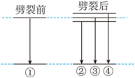 原子处于磁场中, 某些能级会发生辟裂。某种原子能级辟裂前后的部分能级图如图 所示, 相应能级跃迁放出的光子分别设为(1)(2)(3) (4)。若用(1)照射某金属表面时能发生光 电效应, 且逸出光电子的最大初动能为 $E_k$, 则