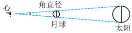 在地球上观察,月球和太阳的角直径(直径对应的张角)近似相等,如图所示。若月球绕地球运动的周期为T₁,地球绕太阳运动的周期为T₂,地球半径是月球半径的k倍,则地球与太阳的平均密度之比约为