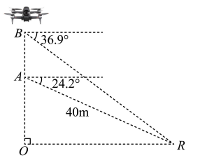 如图, $O, R$ 是同一水平线上的两点, 无人机从 $O$ 点坚直上升到 $A$ 点时, 测得 $A$ 到 $R$ 点的距离为 $40 m, R$ 点的俯角为 $24.2^{\circ}$, 无人机继续坚直上升到 $B$ 点, 测得 $R$ 点的俯角为 $36.9^{\circ}$. 求无人机从 $A$ 点到 $B$ 点的上升 高度 $A B$ (精确到 $0.1 \mathrm{~m}$ ). 参考数据: $\sin 24.2^{\circ} \approx 0.41, \cos 24.2^{\circ} \approx 0.91, \tan 24.2^{\circ} \approx 0.45, \sin 36.9^{\circ} \approx$ $0.60, \cos 36.9^{\circ} \approx 0.80, \tan 36.9^{\circ} \approx 0.75$.