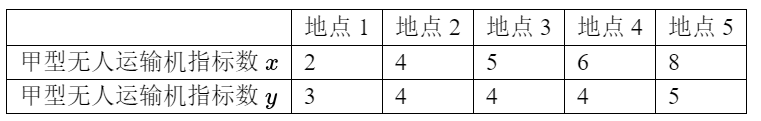 (I) 该公司分别收集了甲型无人运输机在 5 个不同的地点测试的两项指标数 $x_i, y_i(i=1,2,3,4,5)$, 数 据如下表所示: