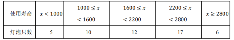 某厂生产了 1000 只灯泡. 为了解这 1000 只灯泡的使用寿命, 从中随机抽取了 50 只灯泡进行检测, 获得 了它们的使用寿命 (单位: 小时), 数据整理如下: