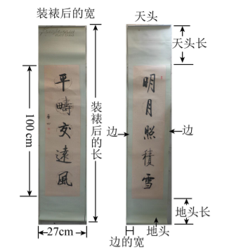 对联是中华传统文化的瑰宝, 对联装裱后, 如图所示, 上、下空白处分别称为天头和地头, 左、右空 白处统称为边. 一般情况下, 天头长与地头长的比是 6: 4 , 左、右边的宽相等, 均为天头长与地头长的和 的 $\frac{1}{10}$. 某人要装裱一副对联, 对联的长为 $100 \mathrm{~cm}$, 宽为 $27 \mathrm{~cm}$. 若要求装裱后的长是装裱后的宽的 4 倍, 求边的宽和天头长. (书法作品选自 《启功法书》)