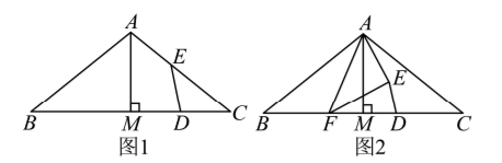 在 $\triangle A B C$ 中、 $\angle B=\angle C=\alpha\left(0^{\circ} < \alpha < 45^{\circ}\right), A M \perp B C$ 于点 $\mathrm{M}, \mathrm{D}$ 是线段 $M C$ 上的动点 (不与点 $\mathrm{M}, \mathrm{C}$ 重合), 将线段 $D M$ 绕点 $\mathrm{D}$ 顺时针旋转 $2 \alpha$ 得到线段 $D E$.