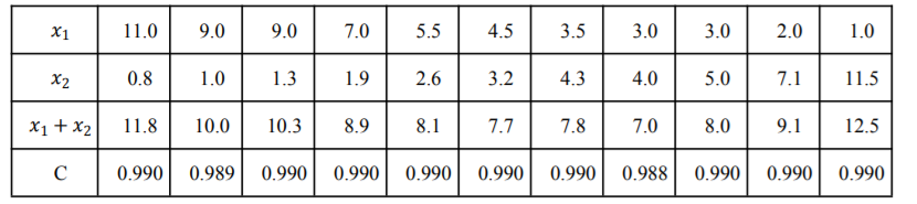 记第一次用水量为 $x_1$ 个单位质量, 第二次用水量为 $x_2$ 个单位质量, 总用水量为 $\left(x_1+x_2\right)$ 个单位质量, 两 次清洗后测得的清洁度为 $\mathrm{C}$. 记录的部分实验数据如下: